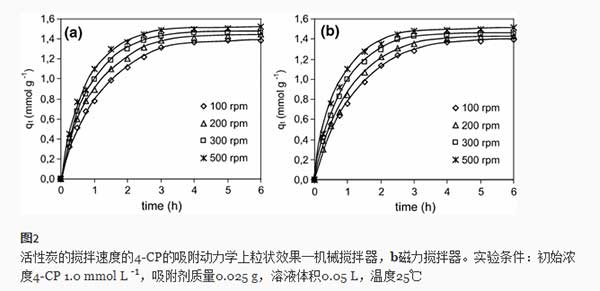 可以看出,吸附速率受攪拌速度的影響很大 - 吸附速率隨攪拌速度顯著增加。隨著攪拌速率從100rpm增加到500rpm,k 2值分別從0.577增加到1.264g mmol -1 h -1(機械攪拌器)和0.560-1.231g mmol -1 h -1(磁力攪拌器)。在相同的攪拌速度下,機械攪拌器和磁力攪拌器之間的差異沒有統(tǒng)計學(xué)意義(p > 0.05)。隨著攪拌速度的提高,4-CP分子從大塊液體向活性炭顆粒周圍的液體邊界層擴散的速率變得更高,這是因為紊流的增強和液體厚度的減小邊界層。隨著攪拌速度的增加,吸附劑顆粒破碎的程度增加,這種效果可能會進一步增強。在這些研究中,試驗前和試驗后的吸附劑的顆粒大小沒有測定,但在4-CP的吸附動力學(xué)的活性炭的粒子大小的影響是有據(jù)可查的。還描述了攪拌速度吸附率的增加為堿性染料的吸附上活性白土[ 6 ]以及乙酸,吡蟲啉和4-氯苯酚在活性炭上。