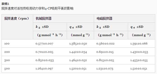 表1中的數(shù)據(jù) 也表明,攪拌速率不僅影響吸附動力學(xué),而且影響4-CP從水中的去除效率。吸附容量從1.385增加到1.520 mmol·g -1(機械攪拌器)和從1.391增加到1.510 mmol·g -1(磁力攪拌器),攪拌速度從100增加到500rpm。觀察到從20.06 4-CP的吸附容量的增加至23.04毫克克-1攪拌速度從300到600轉(zhuǎn)。然而,一些作者已報道,用增加攪拌速度只能達到一定的限度,超過此有在吸附容量無顯著增加吸附增加。在一些情況下,觀察到在更高的攪拌速率在吸附容量的降低。正如作者所提出的,這是由于這樣一個事實,即在非常高的攪拌速度下,吸附分子和吸附劑顆粒的動能增加到足以使它們相互碰撞而導(dǎo)致分離松散結(jié)合的吸附分子。