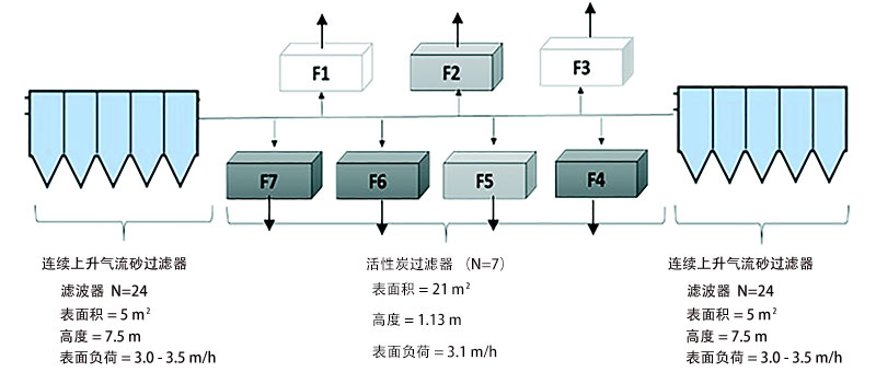 圖1:連續(xù)上流砂濾器和活性炭平行下游過濾器的示意圖。深灰色框(F4,F(xiàn)6和F7)是經(jīng)過改造的活性炭過濾系統(tǒng),淺灰色框(Rf2和Rf5)是未改造參考活性炭。存在附加過濾器(F1和F3)。
