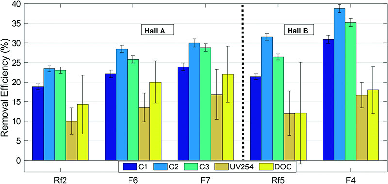 圖2:改造后的(F6,F(xiàn)7和F4)和參考(Rf2和Rf5)過濾器中活性炭對有機(jī)物級分的去除效率。誤差棒表示通過誤差傳播計(jì)算的標(biāo)準(zhǔn)誤差(N=4)。