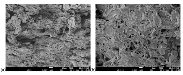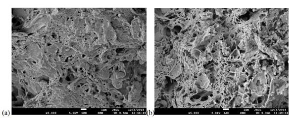 根據(jù)觀察到的活性炭微觀結(jié)構(gòu)來進(jìn)行形態(tài)研究。圖1顯示了在650°C(a)和850°C(b)兩種不同溫度下用25%H3PO4制成的活性炭的比較?梢钥闯,與650℃相比,在850℃下制備的活性炭具有稍大的孔?梢缘弥左w積隨著活化溫度的升高而逐漸增加。