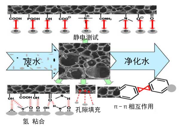 應(yīng)該注意的是,對(duì)活化過(guò)程的理解是優(yōu)化活性炭制備的基本步驟。實(shí)際上,各種化學(xué),物理和物理化學(xué)方法被用于從不同的天然或合成資源合成活性炭;瘜W(xué)處理涉及通過(guò)浸漬然后熱解使用活化劑,而物理過(guò)程涉及在蒸氣或二氧化碳存在下的高溫?zé)崽幚。但是,這兩種方法的組合也已用于生產(chǎn)活性炭。根據(jù)所采用的處理方法,很難預(yù)測(cè)碳的物理化學(xué)和形態(tài)特性?磥(lái)形態(tài),物理化學(xué),質(zhì)地,通過(guò)改變活化時(shí)間和溫度以及所用前體的性質(zhì),活性炭的表面性質(zhì)會(huì)發(fā)生顯著變化;钚蕴勘砻娴幕瘜W(xué)性質(zhì)取決于存在于表面上的雜原子的類型,例如氧,氮,硫等。這些積累在表面上的雜原子或基團(tuán)要么來(lái)自原材料本身,要么在活化過(guò)程中被引入。這在很大程度上與前體的性質(zhì)有關(guān)。所有這些特性對(duì)于使用碳作為水溶液中污染物的吸附劑具有重要意義。實(shí)際上,污染物在活性炭上的吸附是一個(gè)復(fù)雜的過(guò)程,在涉及物理作用和/或化學(xué)鍵的過(guò)程中,各種相互作用可以共存。從而,可能發(fā)生的吸附機(jī)理為靜電相互作用,氫鍵,π-π堆積相互作用,孔填充,疏水相互作用,離子交換以及其他相互作用(n-π相互作用等)和絡(luò)合反應(yīng)。圖2說(shuō)明了在活性炭上吸附污染物的主要相互作用方法。