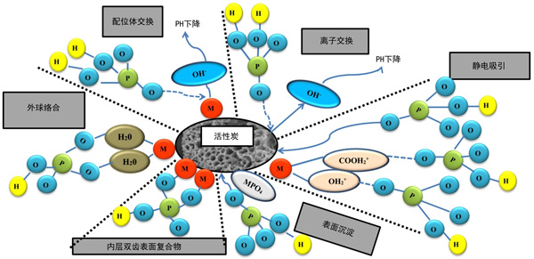 通常,磷的吸附過程是活性炭中的吸熱反應。等溫線包括Freundlich,Langmuir和Langmuir-Freundlich能夠預測廢水中活性炭對磷的吸附。在這些條件下,Langmuir通常更適合實驗數據。圖2總結了磷在活性炭表面上吸附的各種機理。一些機制以高親和力和強度(例如,配體交換和內球雙齒)將磷固定在其表面上,而另一些機制以較低的強度(例如,外球絡合和靜電吸引)固定在磷表面,從而降低了除磷效率。