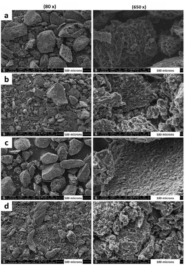 我們使用現(xiàn)代分析技術來了解制備的活性炭催化劑的真實性質(zhì),掃描電子顯微鏡(SEM)是查看材料形態(tài)的強大工具。圖1顯示了四種活性炭樣品的SEM圖像。圖像是在兩個不同的分辨率,以比較不同比例的樣本。評估不同煅燒溫度的影響是很重要的。圖1的左側圖像顯示,無論煅燒溫度如何,所有樣品的表面都被各種亞微米大小的顆粒所掩蓋,并且表面上存在許多明顯的解理。不同煅燒溫度下的熱解對活性炭樣品的形貌影響不大,但有輕微的變化,如一些顆粒從表面被去除,一些解理被侵蝕。此外,從這些SEM圖像可以推斷,這些活性炭材料中的許多微孔結構使其成為任何化學反應中反應物相互作用的極好載體。