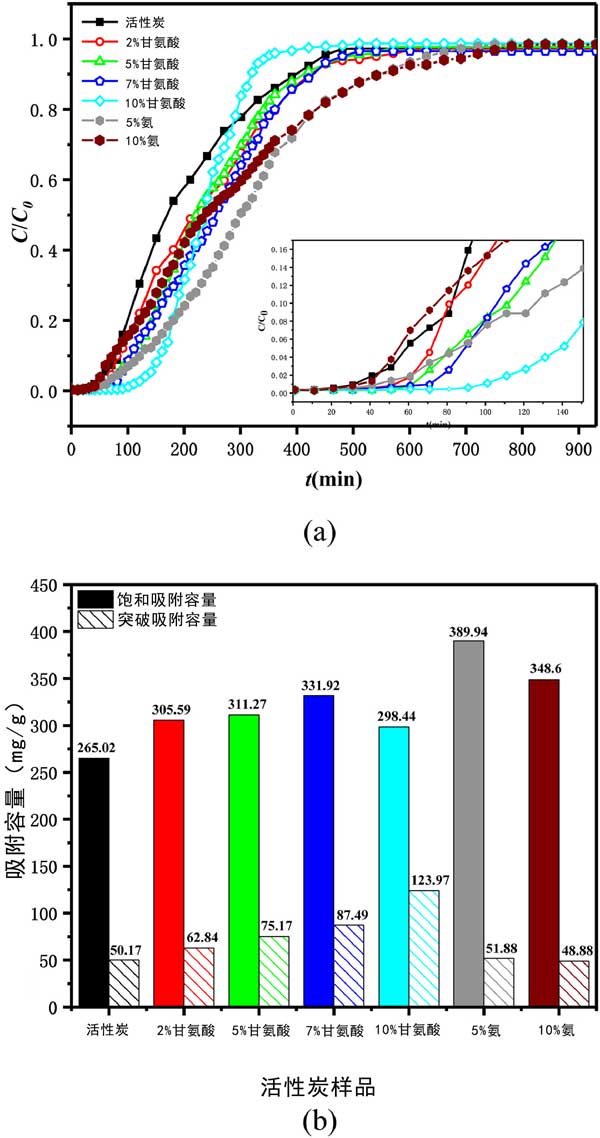 測(cè)試了選定的甲苯VOC對(duì)活性炭的吸附性能。在每個(gè)實(shí)驗(yàn)運(yùn)行中,甲苯通過(guò)裝有活性炭的吸附管直到達(dá)到平衡,即活性炭吸附劑被甲苯飽和。圖2(a)所示的穿透曲線呈現(xiàn)為甲苯吸附量吸附(ç/ç0)與接觸時(shí)間(噸,分鐘)六種的活性炭正在進(jìn)行中,它們的飽和和突破吸附容量如圖2所示(b)。從吸附曲線可以看出,甘氨酸修飾的活性炭的穿透時(shí)間明顯延長(zhǎng),而飽和氨改性活性炭的時(shí)間延長(zhǎng);钚蕴可霞妆酱┩肝侥芰Φ捻樞?yàn)?0%甘氨酸改性活性炭>7%>5%>2%>5%氨改性活性炭>未改性活性炭>10%氨改性活性炭,而活性炭對(duì)甲苯飽和吸附容量的順序如下:5%氨改性>10%>7%甘氨酸改性>5%>2%>10%>未改性活性炭?梢姼拾彼嵝揎棇(duì)甲苯吸附有顯著的正向影響。與原來(lái)的AC相比,甘氨酸改性的活性炭對(duì)甲苯的突破吸附能力分別提高了25%、50%、74%和147%,隨著甘氨酸濃度的增加呈上升趨勢(shì)。同時(shí),甘氨酸改性的活性炭對(duì)甲苯的飽和吸附容量分別增加了15%、17%、25%和13%,且隨著甘氨酸濃度的增加先增加后減少。5%和10%的氨改性也提高了甲苯的吸附性能,但其優(yōu)勢(shì)主要體現(xiàn)在飽和吸附容量上,與原來(lái)的活性炭相比,分別提高了47%和32%。