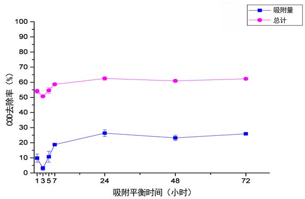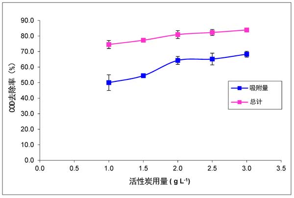 圖2顯示了在25℃、pH=7.5和170rpm的攪拌速率下,不同活性炭用量對COD去除的影響,持續(xù)24小時(shí)。我們測試了1.0、1.5、2.0、2.5和3.0g活性炭以確定合適吸附劑劑量。隨著活性炭濃度從1g增加到3g,觀察到COD去除率從50.0±5.1%和74.5±2.6%逐漸增加到吸附和總量的68.3±1.9%和83.9±1.0%。COD濃度從280.0±28.3略微下降至177.5±10.6mg。許多研究都報(bào)告說,隨著活性炭用量的增加,有機(jī)材料的去除率也會(huì)增加,這可以通過總比表面積和吸附劑上的活性位點(diǎn)來解釋。