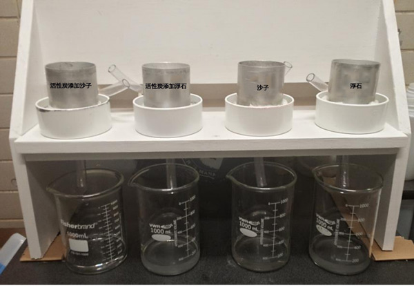 酸二氫鉀在去離子水中制備磷溶液,將活性炭稱重到試管中,,并用36mL的16.3mg/L-1正磷酸鹽平衡,僅包括沙子或浮石樣品。將管在端到端振蕩器上以90min-1的頻率平衡24小時,并通過0.2-μm膜過濾器過濾上清液。根據(jù)鉬酸鹽法,使用UV-VIS分光光度計分析濾液中的正磷酸鹽?偣16根柱子(直徑7.62厘米,高7.62厘米)用沙子或浮石填充到4.56厘米的深度(圖2)。十六列對應于由兩種過濾器(沙子或浮石)和四種活性炭改進材料組成的實驗,包括對照(無添加活性炭),一式兩份。將含活性炭改良劑和不含活性炭改良劑(按重量計5%)的沙子或浮石混合,然后將其干填充到柱中。每個柱子的底部都用粗棉布保護,這樣可以大限度地減少過濾材料的損失。