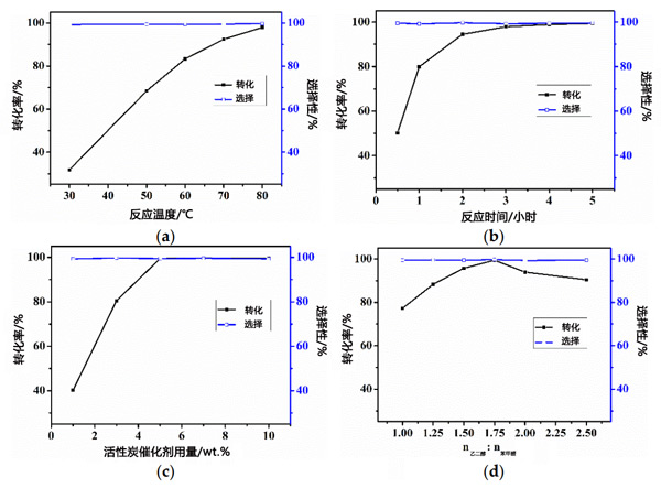 以苯甲醛與乙二醇的縮合反應(yīng)為探針反應(yīng),研究了活性炭在縮醛和縮酮合成中的催化性能。一般程序如下:10mL溶劑環(huán)己烷、25mmol苯甲醛,將43.75mmol乙二醇和0.13g活性炭催化劑在配備有溫度計和回流冷凝器的三頸燒瓶中混合,并在80℃下反應(yīng)5小時。測試了反應(yīng)溫度、反應(yīng)時間、催化劑用量和乙二醇/苯甲醛摩爾比對苯甲醛轉(zhuǎn)化率的影響。同時,測試了活性炭在苯甲醛與乙二醇縮合反應(yīng)中的催化回收性能,并討論了不同基材的適用性。