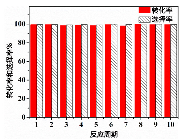 最后通過回收實驗測試了活性炭催化劑的穩(wěn)定性,測試結(jié)果如圖3所示。在催化劑可重復(fù)使用性能的探索中,活性炭催化劑用溶劑環(huán)己烷洗滌,然后進(jìn)入下一個反應(yīng)循環(huán)。具體過程為將反應(yīng)完成后的固體離心分離出來,再用環(huán)己烷洗滌固體3次,以完全去除前一輪反應(yīng)表面殘留的少量液體。即使在連續(xù)運(yùn)行10次后,催化劑的性能也沒有顯著降低,仍然達(dá)到99%的苯甲醛轉(zhuǎn)化率和99%的選擇性。因此,活性炭催化劑是用于研究苯甲醛乙二醇縮醛反應(yīng)的優(yōu)異且穩(wěn)定的可回收固體酸催化劑。