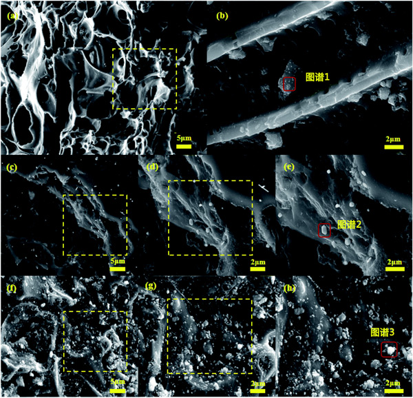 活性炭和鋅鹽失活催化劑的SEM圖像在圖2顯示。從圖2a和b可以看出,載銅活性炭催化劑具有良好的孔結(jié)構(gòu),不同尺寸的金屬氧化物顆粒分布在催化劑表面。放大5000倍后(圖2b),有利于反應(yīng)氣體吸附的孔結(jié)構(gòu)仍清晰可見(jiàn)。圖2c-e顯示ZnCl2-活性炭催化劑的大部分表壁坍塌,孔結(jié)構(gòu)嚴(yán)重受損,表明ZnCl2摻雜后活性炭結(jié)構(gòu)強(qiáng)度降低。圖2f-h表明ZnSO4-活性炭催化劑基體受到一定程度的破壞,表面粗糙,孔隙結(jié)構(gòu)幾乎看不到,僅在某些位置附著較大的金屬氧化物顆粒,局部堆積。這種團(tuán)聚現(xiàn)象發(fā)生在ZnSO4摻雜后的催化劑表面,不利于CO和NO氣體的吸附,導(dǎo)致脫硝活性下降。