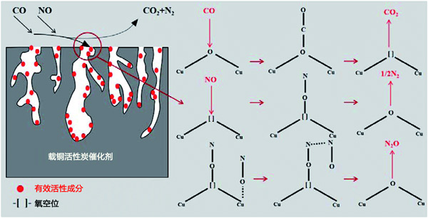 在活性炭催化劑表面通過(guò)選擇性催化還原技術(shù)(CO-SCR)反應(yīng)進(jìn)行的低溫脫硝是一種具有代表性的非均相催化體系,遵循Langmuir-Hinshelwood反應(yīng)機(jī)理。因此,提出了圖3所示的脫硝機(jī)制,用于在活性炭催化劑上對(duì)NO進(jìn)行CO還原;钚越M分Cu均勻分散在活性炭上,增加了催化劑的比表面積和對(duì)NO和CO的吸附。這一結(jié)論表明Cu均勻分布在活性炭催化劑的表面,將脫硝效率提高到80%。CO吸附在催化劑表面以還原-O-Cu2+到=Cu+并生成CO2。吸附的NO解離成N和O,解離的N原子與NO分子結(jié)合形成N2O。據(jù)報(bào)道,NO的解離是CO誘導(dǎo)的NO消除的關(guān)鍵步驟;钚晕稽c(diǎn)的釋放促進(jìn)了CO的吸附,最后N2O和=Cu+反應(yīng)生成N2和–O–Cu2+,這進(jìn)一步促進(jìn)了脫硝反應(yīng)。在CO與NO的反應(yīng)中,Cu2+↔Cu+交換可能會(huì)改變催化劑表面的價(jià)態(tài),更多的氧空位可用于轉(zhuǎn)化過(guò)程,促進(jìn)NO向N2的轉(zhuǎn)化。