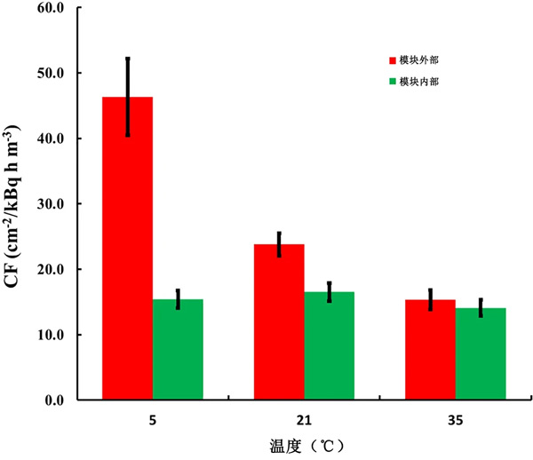 對于實(shí)驗(yàn),使用三種活性炭的織物為探測器設(shè)計(jì)了單獨(dú)的模塊。對于前兩種活性炭,模塊是HDPE,對于第三種活性炭,模塊是LDPE。單獨(dú)設(shè)計(jì)遵循上述方法,考慮到每種活性炭織物的確切單獨(dú)質(zhì)量。在所有設(shè)計(jì)中,不同溫度下的k(T)值根據(jù)方程式計(jì)算;钚蕴康慕Y(jié)果如圖2所示。5℃時(shí)的CF0比35℃時(shí)的CF0高305%。相比之下,對于放置在補(bǔ)償模塊中的傳感器,CF的變化在17%以內(nèi)(最大值/最小值=1.17)。值得注意的是,在模塊內(nèi)部不同溫度下暴露的傳感器的CF之間的配差異在95%的顯著性水平上沒有統(tǒng)計(jì)學(xué)意義。發(fā)現(xiàn)所描述的帶有補(bǔ)償模塊的探測器的CF明顯高于其他常用的無源氡探測器。