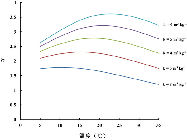 查看活性炭的檢測器的結(jié)果(圖2)可以看出,相同溫度下的CF0在活性炭之間存在差異。這意味著不同活性炭的吸附能力存在一些差異。在所有模塊設(shè)計(jì)中,假設(shè)21℃下的吸附容量值為4m3/kg-1。然而,由于我們的實(shí)驗(yàn)結(jié)果表明不同活性炭材料的k可能存在差異。不同k值的結(jié)果如圖3所示?梢钥闯觯瑢τ趨^(qū)間2-6m3/kg-1內(nèi)的所有k值,η的變化(例如最大/最小比率)與溫度的變化遠(yuǎn)小于未包裝傳感器觀察到的230-305%的變化。