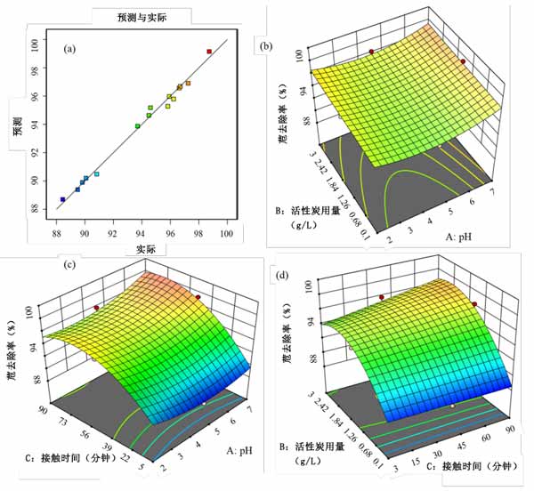 圖2:(a)預(yù)測的乙腈去除量與實際去除量的關(guān)系圖,(b)乙腈去除量的pH值與活性炭用量的3D圖,(c)乙腈去除量的pH值與接觸時間的3D圖,(d)3D圖接觸時間與活性炭用量的苊去除圖。