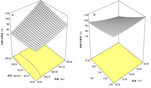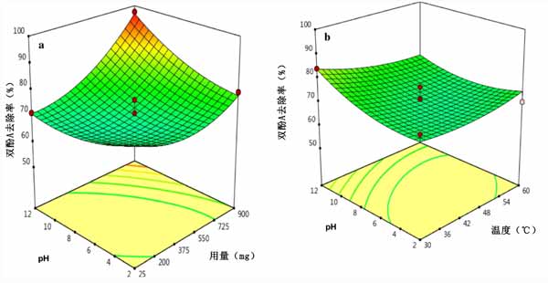 圖3:雙酚A去除效率對磁力活性炭影響的響應(yīng)面3-D(a)pH和劑量以及(b)pH和溫度。