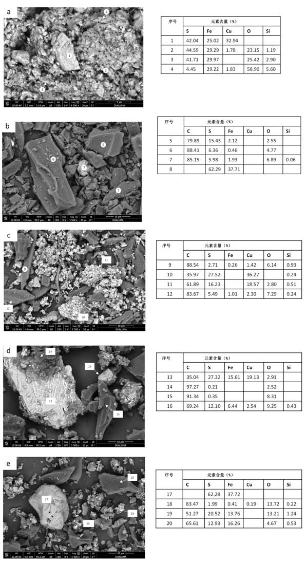 圖2:浸出96小時后獲得的最終殘留物的SEM-EDS圖像(a)黃銅礦礦石,(b)礦物:活性炭1:1,(c)礦物:活性炭1:0.25,(d)礦物:生物炭1:1,(e)礦物:生物炭1:0.25。