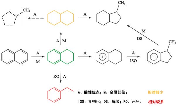 萘在改性活性炭催化劑上的加氫路徑如圖4所示。與氧化鋁催化劑上的類似,活性炭催化劑上的萘在酸性位點(diǎn)和MoS2的共同作用下可以生成四氫化萘和十氫化萘。四氫化萘在酸性位點(diǎn)與烷基苯形成碳鎓離子,然后異構(gòu)化為甲基-茚碳正離子,最后在活性位點(diǎn)解吸成1-甲基-茚滿。同時(shí),四氫化萘在酸性位點(diǎn)受到溢氫作用時(shí),苯環(huán)的α位和γ位斷裂,生成乙苯。通過從酸性位點(diǎn)上的MoS2活性位點(diǎn)溢出氫氣,萘烷進(jìn)一步加氫裂化為1-甲基-茚滿。與氧化鋁催化劑相比,活性炭催化劑產(chǎn)生更多的四氫化萘和更少的萘烷,這是因?yàn)榛钚蕴看呋瘎┍妊趸X具有更少的酸位。