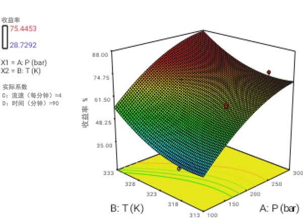 在本節(jié)中,使用三維圖檢查了不同操作參數(shù)對(duì)活性炭超臨界再生的影響,而其他變量保持在其各自固定的中間水平(壓力,200bar,溫度45℃,流速,4g/分鐘和時(shí)間90分鐘),對(duì)應(yīng)于零代碼。圖2顯示了壓力和溫度影響的3D圖。可以觀察到,再生產(chǎn)率隨著壓力和溫度分別從100bar增加到300bar和從40增加到60℃而增加;谥行膹(fù)合設(shè)計(jì),壓力對(duì)再生產(chǎn)率的影響最重要。特別是,壓力的增加導(dǎo)致CO2的溶解能力增加,因此溶質(zhì)的溶解度也增加。另一方面,溫度的升高對(duì)再生產(chǎn)量有輕微的積極影響。在100~300bar的壓力下,隨著溫度的升高,溶質(zhì)的溶解度增加,這是由于溶質(zhì)蒸氣壓增加的作用。因此,溶質(zhì)的溶解度隨著溫度的升高而增加。另一方面,提取物蒸氣壓隨著溫度升高而升高,這導(dǎo)致超臨界流體擴(kuò)散率增強(qiáng)。