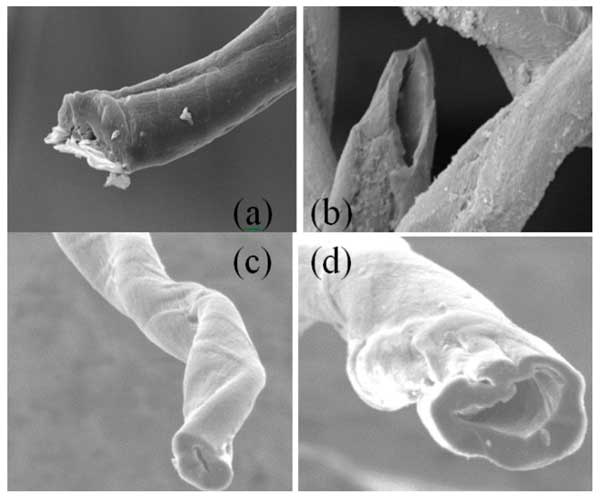 通過煅燒和HNO3、H2O2和KOH活化,廢棉纖維成功轉(zhuǎn)化為不同結(jié)構(gòu)的活性炭。圖1顯示了三種活性炭的SEM圖像?梢钥闯,化學(xué)活化有助于大孔隙的形成。在整個纖維長度上可以觀察到一個空心芯,直徑約為0.5–5.0µM,形狀幾乎為圓形;钚蕴烤哂懈叨榷嗫椎慕Y(jié)構(gòu),核心直徑在大約0.5和5μM之間(圖1b,d)。這種大孔隙率可能與纖維內(nèi)壁木質(zhì)素的化學(xué)破壞有關(guān)。參考活性炭(圖1a)呈現(xiàn)大孔隙,而形態(tài)特征是纖維中芯的出現(xiàn),其直徑取決于活化劑。使用過氧化氫作為活化試劑獲得最大直徑(圖1b)。如圖1b-d所示,前體的結(jié)構(gòu)(最初具有干凈的表面)在每次化學(xué)處理后都會被破壞。有趣的是,其中一種活性炭的表面在化學(xué)活化的影響下發(fā)生明顯變化(與其他活性炭相比)。