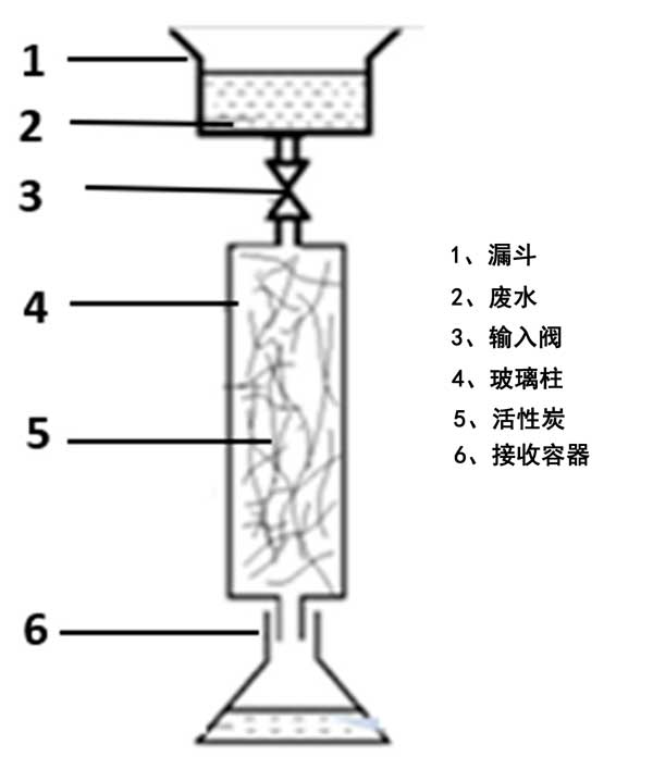 通過在密封玻璃瓶中將已知量(4.0g)的活性炭與50mL實(shí)際廢水樣品進(jìn)行反應(yīng),進(jìn)行批量吸附平衡實(shí)驗(yàn)。測試了具有不同初始硫濃度(100、300、500、800和1000mg·L-1)的五個樣品。將瓶子在恒溫?fù)u床上放置24小時,直至達(dá)到平衡(最終pH值:10.5)。用于床吸附實(shí)驗(yàn)的裝置的示意圖如圖2所示。將碳化纖維填充到玻璃柱中以研究它們的吸附能力。廢水被引入漏斗并通過輸入閥以將流量調(diào)節(jié)為4–5.10m3·h-1。首先,使用流經(jīng)柱的蒸餾水潤濕床吸附裝置以改善活性炭纖維的潤濕特性。其次,允許漏斗中的煉油廠廢水樣品內(nèi)容物通過活性炭床通過重力排放到接收容器。每小時回收處理過的水。