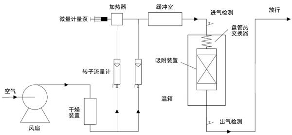 動態(tài)吸附技術(shù)用于測量甲苯吸附平衡等溫線。圖1描述了實驗裝置。通過該裝置獲得吸附飽和的活性炭。在不同的溫度和濃度下,測量了甲苯的飽和吸附容量。入口溫度和甲苯濃度設(shè)定為25–180℃和5–50g/m3。活性炭吸附的甲苯氣體濃度為15g/m3。使用重量分析技術(shù)測量吸附等溫線。實驗裝置以實驗室環(huán)境空氣為氣源,通過鼓風(fēng)機將空氣送入裝置。在硅膠干燥裝置中除去水蒸氣后,通過數(shù)顯質(zhì)量流量計的控制,按計算出的比例分成兩路。單向氣流以設(shè)定濃度進入氣體發(fā)生裝置,即甲苯揮發(fā)后的載氣,在氣體緩沖室中與反向流動的稀釋氣體充分混合后進入吸附系統(tǒng)。在吸附系統(tǒng)中,吸附柱緊密均勻地填充CTC100活性炭顆粒,并用鐵架垂直放置在設(shè)定實驗溫度的恒溫干燥箱中;旌霞妆綒怏w首先在恒溫干燥箱內(nèi)通過氣體預(yù)熱管道達到實驗溫度,然后進入裝有活性炭的吸附柱進行吸附實驗。吸附氣體通過檢測口進入檢測系統(tǒng),智能FID通過連續(xù)采樣測量甲苯出口濃度。當(dāng)氣體發(fā)生裝置產(chǎn)生的入口濃度與智能FID檢測的出口濃度一致時,吸附柱中的活性炭達到吸附平衡。吸附氣體通過檢測口進入檢測系統(tǒng),智能FID通過連續(xù)采樣測量甲苯出口濃度。當(dāng)氣體發(fā)生裝置產(chǎn)生的入口濃度與智能FID檢測的出口濃度一致時,吸附柱中的活性炭達到吸附平衡。吸附氣體通過檢測口進入檢測系統(tǒng),智能FID通過連續(xù)采樣測量甲苯出口濃度。當(dāng)氣體發(fā)生裝置產(chǎn)生的入口濃度與智能FID檢測的出口濃度一致時,吸附柱中的活性炭達到吸附平衡。