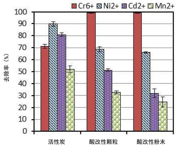 顆;钚蕴康乃崽幚砼c未處理的活性炭相比,Cr6+去除效率提高了30%,而Ni2+、Mn2+和Cd2+分別降低了23%、36%和37%。這可以通過與其他離子相比更高的離子勢和Cr6+的小尺寸來解釋。這將導致Cr6+對酸性表面基團的吸引力更強,并更快地擴散到活性炭的孔隙中。高正電的Cr6+離子會吸附在孔隙邊緣的酸性功能位點上,排斥其他較弱的重金屬離子,降低它們對活性炭孔隙的可及性。