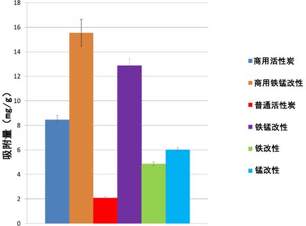 為了比較各種活性炭吸附砷(V)的效果,將0.1克活性炭添加到50mL/50ppm砷(V)樣品中。將樣品以150rpm攪拌6小時(shí),然后過濾,然后對濾液進(jìn)行元素分析。為了比較不同活性炭基質(zhì)的功效,以每克活性炭吸附的砷(V)毫克數(shù)(mg/g)來比較相對于添加的活性炭量的吸附。如圖所示數(shù)字圖1,與鐵、錳和鐵/錳一起官能化后,砷的吸附有顯著改善。