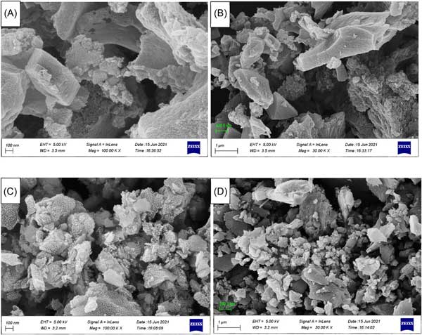 圖2:活性炭吸附劑的SEM:(A、B)活性炭(C、D)改性活性炭吸附劑。