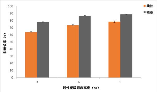 柴油和模型柴油用作油原料,以評估活性炭和改性活性炭的脫硫工藝。柴油初始硫濃度為7510ppm。兩種柴油原料用于固定床吸附塔裝置的脫硫工藝。為了進行脫硫實驗,使用計量泵將油原料送入塔中。采用垂直向下固定床吸附塔裝置連續(xù)吸附硫化合物,流量為1mLs-1。柱子逐漸裝載不同高度的活性炭層(3-9厘米),對應于不同的活性炭重量(10、7和4克)。