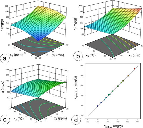 圖3:3D響應(yīng)曲面圖說明了雙自變量的綜合影響(a)接觸持續(xù)時(shí)間與入口濃度(x1—x2)、(b)接觸持續(xù)時(shí)間與溫度(x1—x3)和(c)入口濃度與溫度(x2—x3)和(d)比較苯吸附的實(shí)際吸附容量(q)和預(yù)測吸附容量(q)的圖。