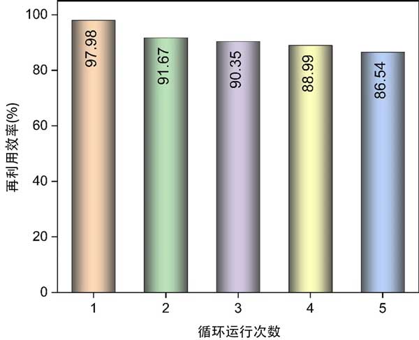 吸附劑的可重復(fù)使用性和吸附穩(wěn)定性在評估所開發(fā)方法的實(shí)際適用性方面起著至關(guān)重要的作用。事實(shí)上,吸附劑的可重復(fù)使用性能是實(shí)際應(yīng)用的首要標(biāo)準(zhǔn),并影響吸附過程的總體成本;钚蕴勘秸羝降脑倮眯适窃谖鍌(gè)連續(xù)的回收循環(huán)后確定的。如圖4所示,經(jīng)過五次連續(xù)回收過程后,活性炭苯蒸氣的再利用效率為86.54%。強(qiáng)大的可重復(fù)使用性和吸附穩(wěn)定性表明活性炭吸附劑和苯吸附物之間存在范德華力或π-π相互作用。相反,不完全的再生過程可歸因于吸附表面上永久鍵的形成,導(dǎo)致吸附基團(tuán)的不可逆轉(zhuǎn)化。換句話說,一些在再生過程中未解吸的化學(xué)結(jié)合吸附物可能會堵塞孔隙,導(dǎo)致殘留物形成。