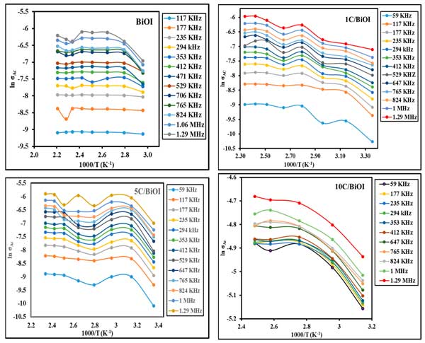 圖4:溫度對(duì)BiOI、1C/BiOI、5C/BiOI和10C/BiOI納米復(fù)合材料在不同頻率下交流電導(dǎo)率的影響。