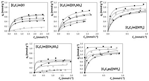 得到的結(jié)果表明,活性炭的不同的吸附能力與IL的性質(zhì)和溶液中的鹽量有關(guān)。一般而言,對于咪唑鎓的ILs,陰離子對其對活性炭的吸附能力的影響按照以下順序:Cl - ≈[CH 3 SO] <[CF 3 SO 3 ] -<[NTf 2 ] 。這一趨勢的結(jié)果和預(yù)計(jì)的相符合,并且表明,隨著陰離子疏水性的增加,活性炭對ILs的吸附逐漸增加。另一方面,考慮到IL陽離子家族,活性炭能吸附更多的吡啶鎓比基于咪唑類的對應(yīng)物。總之,這里證明,如果伴隨使用無機(jī)鹽來促進(jìn)鹽析現(xiàn)象并增強(qiáng)隔離度,則活性炭也可以用作水介質(zhì)中低濃度存在的親水性IL的有效吸附劑。得到的結(jié)果表明, 在鹽的存在下,親水性ILs的例如[C 4 C 1 im] Cl和[C 4 C 1 im] [CH 3 SO3 ]的K d值增加高達(dá)5.5倍。這種新方法可以被設(shè)想為減少由使用IL的工業(yè)過程產(chǎn)生的含水物流污染的有希望的途徑。
