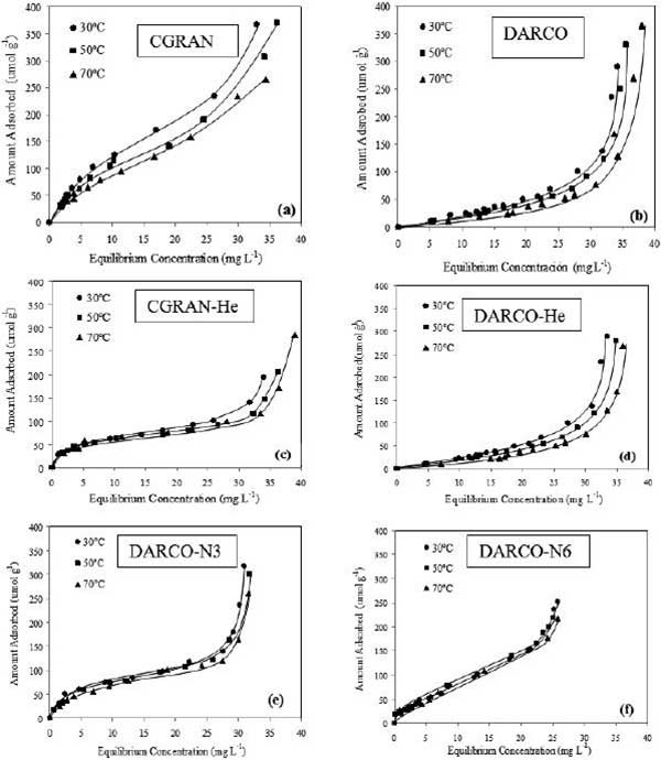 評(píng)估原樣處理的活性炭對(duì)松香酸的吸附情況,結(jié)果如圖1所示。該圖描繪了在處理前和后處理的CGRAN和DARCO活性炭的三種溫度(30,50和70℃)下作為平衡濃度函數(shù)的吸附容量。從先前對(duì)吸附速率的研究(此處未顯示),確定在30分鐘達(dá)到吸附平衡。根據(jù)分類等溫線,CGRAN和CGRAN-He(圖1a和1c)顯示了“L”型等溫線,這是樅酸和吸附位點(diǎn)之間強(qiáng)親和力的特征。DARCO(圖1b)和DARCO-He(圖1d)活性炭表現(xiàn)出“S”型等溫線,歸因于溶質(zhì)和溶劑之間競(jìng)爭(zhēng)吸附的結(jié)果,松香酸對(duì)吸附位點(diǎn)的親和力較低。圖1e和1f所示的HNO3氧化樣品(DARCO-N3和DARCO-N6)的 等溫線為“L”型吸附等溫線,樅酸和溶劑之間具有強(qiáng)親和力的特征。26,27另外,DARCO-N3展示了一個(gè)被歸類為“L2”的等溫線,其中平臺(tái)指示表面上的所有可用位點(diǎn)均分布在單層中,并且DARCO-N6根據(jù)“L1”子群顯示等溫線,其中沒有觀察到高原,表明未覆蓋單層。 這種行為與DARCO-N6顯示的更多的表面功能組一致。
