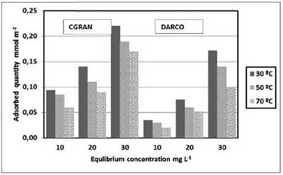 為了確定表面氧基團(tuán)的具體影響,通過S BET將吸附容量標(biāo)準(zhǔn)化。如圖2所示,CGRAN活性炭具有比DARCO活性炭更高的松香酸吸附容量。在測(cè)試的三個(gè)溫度下觀察到CGRAN的更大的吸附容量。根據(jù)平衡濃度CGRAN的平均吸附能力高2-3倍。然而,由于更大的吸附潛力,這種差異在較高的平衡濃度值下降。表面積歸一化吸附量表明,氧官能團(tuán)的存在對(duì)活性炭的吸附能力起著重要的作用。CGRAN的較高的吸附能力可通過的強(qiáng)酸位的存在來(lái)解釋(作為較高量的官能團(tuán)的結(jié)果),有利于松香酸的吸附高達(dá)30毫克的L -1。對(duì)于DARCO活性炭來(lái)說,情況正好相反。