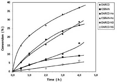 活性炭催化劑的活性在樅酸隨時(shí)間的變化中進(jìn)行測(cè)試,如圖3所示。該圖顯示DARCO催化劑顯示比CGRAN催化劑更高的轉(zhuǎn)化率。圖3還比較了接受活化的碳催化劑與He處理的對(duì)應(yīng)物的轉(zhuǎn)化率:CGRAN-He顯示出比CGRAN催化劑顯著更高的轉(zhuǎn)化率,這是與從TPD,F(xiàn)TIR和酸度結(jié)果推斷的表面氧基團(tuán)數(shù)目較少有關(guān)的行為。DARCO和DARCO-He之間的轉(zhuǎn)化沒有明顯的差異,這與兩種催化劑中表面氧基團(tuán)的量相似。沿同一線,比較DARCO和相應(yīng)的硝酸氧化樣品的活性,如圖3所示。數(shù)據(jù)清楚地顯示了轉(zhuǎn)化率與HNO 3濃度之間的反比關(guān)系用于改性處理。因?yàn)樵谔幚碇鬀]有明顯的變化,所以質(zhì)地特性的影響可以打折扣; 因此,這種行為顯然是酸強(qiáng)度和表面含氧基團(tuán)的效應(yīng),從TPD,F(xiàn)TIR和總酸度結(jié)果得出的DARCO活性炭表面的化學(xué)修飾的證明。DARCO-N6催化劑的最低轉(zhuǎn)化率可以與它們的最高酸強(qiáng)度相關(guān),而DARCO表現(xiàn)出的最高轉(zhuǎn)化率是由于它們的最低酸強(qiáng)度。這些結(jié)果表明,盡管強(qiáng)酸性位點(diǎn)有利于樅酸的吸附,但是它們會(huì)削弱催化活性。這些發(fā)現(xiàn)也表明這些位點(diǎn)對(duì)于催化裂化沒有活性。