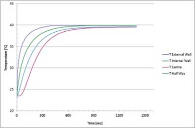 圖2、 當(dāng)設(shè)備從環(huán)境條件轉(zhuǎn)移到40℃的水中時(shí),床中和設(shè)備外表面上的溫度分布。