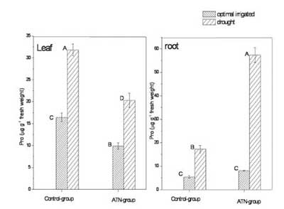 當(dāng)葉片中的游離脯氨酸含量降低時(shí),表明當(dāng)存在活性炭混合物時(shí),干旱條件下植物的生理損傷水平降低。這種影響可能是由于天然硅鋁酸鹽存在的濕度增加。盡管干旱條件誘導(dǎo)了對(duì)照組和活性炭混合物組的根中游離脯氨酸含量的顯著增加,但活性炭組中這種增加更為顯著;钚蕴炕旌衔锝M植物根中游離脯氨酸含量極高,增加了脯氨酸的保護(hù)作用,脯氨酸在植物組織中起到滲透物質(zhì)的作用:使植物更有效地吸收干旱土壤中的水分。