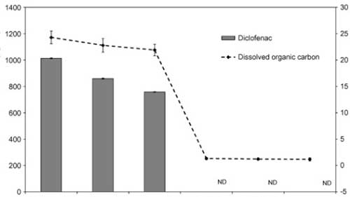 使用活性炭除去雙氯芬酸鈉是定性高效的,通過零吸收和低濃度的DOC的,并且在通過所獲得的色譜中沒有檢測到雙氯芬酸鈉。得在所研究的處理階段中,在活性炭上的吸附導(dǎo)致最顯著的雙氯芬酸鈉去除。因此,雙氯芬酸鈉沒有水樣中的這個(gè)階段(LOD之后檢測 = 2 μg L−1)。考慮到所述方法的定量限為3 μg L−1,通過活性炭除去雙氯芬酸鈉的至少99.7%。因?yàn)闆]有研究活性炭的破裂曲線,所以活性炭的結(jié)果可以被認(rèn)為是定性的。然而,為了研究在大型水處理廠中去除雙氯芬酸鈉,必須改進(jìn)該方法以達(dá)到較低的檢測限(約μg L−1)。