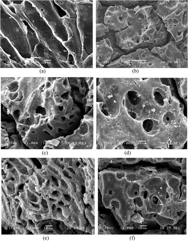 圖1。SEM顯微照片(×1000放大倍數)(a)植物種子(b)活性炭1(c)活性炭2(d)活性炭3(e)活性炭4(f)活性炭5。