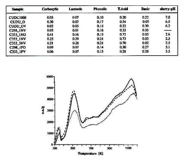 圖1顯示了過(guò)氧化氫處理后產(chǎn)生的活性炭的化學(xué)行為。從上面看出的氧化過(guò)程增加了活性炭的總酸度,并且與羧基和酚類基團(tuán)的增加一致。此外,TPD曲線顯示了放出氣體的增量,峰值集中在與活性炭相同的溫度。低溫和高溫分解組的面積總體增加歸因于羧基-內(nèi)酯類結(jié)構(gòu)和后面的酚類基團(tuán)。H2O2氧化碳的FT-IR光譜在1542和1190cm-1處顯示帶就像那些原始的碳,但后來(lái)的孔隙已經(jīng)擴(kuò)大,顯示出C-O伸展模式的增加?傊,這些研究表明僅在H的性質(zhì)的小變化H2O2處理過(guò)的碳,即,是在氧化時(shí),其類似于由其他研究人員報(bào)告的行為沒(méi)有觀察到變化顯著。其中過(guò)氧化氫溶液的氧化作用明顯地看作羧酸類基團(tuán)的重要減少,伴隨著堿性基團(tuán)的大量增加。