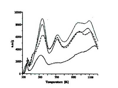 分析表明25℃下的反應(yīng)只產(chǎn)生很小的變化,所以在低溫下HNO 3溶液主要以酸的形式反應(yīng),只對(duì)活性炭產(chǎn)生微小的改變。然而,在80℃下的活性炭反應(yīng)顯示與HNO 3的氧化作用有關(guān)的主要變化,如活性炭中總表面基團(tuán)的總體增加和羧基類似基團(tuán)的最大形成。另外,由樣品的堿度降低可以解釋為6M硝酸溶液處理3小時(shí)后堿性基團(tuán)的延長(zhǎng)氧化的結(jié)果。圖2顯示了這些活性炭的TPD曲線,觀察到新峰的存在,給出了碳的化學(xué)組成的變化,即氧化基團(tuán)的增量。硝酸改性碳的元素分析表明,由其他人觀察到,增加氮含量可以歸因于硝基(NO 2)形成的影響。