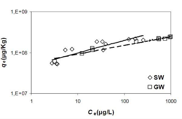 這次實驗?zāi)康氖潜容^淡水和鹽水中活性炭去除菲的結(jié)果,因此不考慮來自水中其他有機(jī)化合物的競爭(使用3.72的表面/孔擴(kuò)散流量比值,典型值為蒸餾水)。該通量比反映了與活性炭的內(nèi)孔相比,目標(biāo)化合物在活性炭顆粒的表面空隙中擴(kuò)散的情況。當(dāng)目標(biāo)化合物在其他競爭化合物或天然有機(jī)物質(zhì)的存在下被吸附時,將使用較低的值(例如0.4)。介紹了菲和活性炭在淡水和鹽水合成溶液中的吸附等溫線。兩個等溫線都是非線性的。Freundlich模型符合數(shù)據(jù),但它不是鹽水等溫線的最佳模型。它用于目前的工作中,以便將結(jié)果與之前的研究進(jìn)行比較,并且為了使用用于活性炭床模型的Freundlich常數(shù)。在圖1中,鹽濃度增加接近水溶性的菲的吸附(在Ce =180μg/ L時,qe從1.9E + 8增加到2.2E + 8; + 15%),但是這種增加隨著菲濃度的降低而降低。在菲濃度約10μg/ L以下時,當(dāng)溶液中存在鹽時,吸附減少(qe從6.0E + 7降至5.4E + 7; - 10%)。對于淡水實驗,Vo計算的中孔體積的47%被測量為470-490cm3 / kg ;贔reundlich模型,Kfr表示為每孔活性炭孔體積的菲吸附量等于52%。