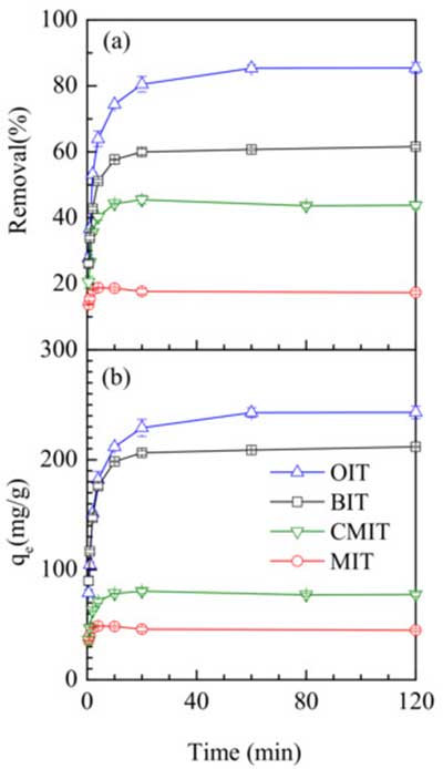 圖1.吸附時(shí)間對(duì)去除異噻唑酮(a)和吸附量(b)在活性炭劑量為100mg·L-1時(shí)在溫度25℃的影響。