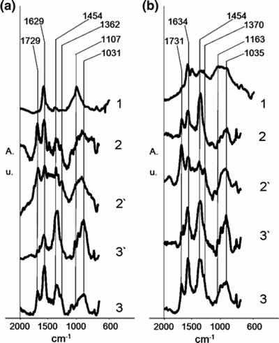 圖2:活性炭-A(a)和活性炭-B(b)的FTIR光譜:初始(1),吸附(2-3)和電化學環(huán)化(2',3')從含有4-氯苯氧基乙酸的電解質(zhì)溶液。