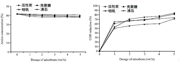 該單乙醇胺廢水含有許多類型的分子和離子。因此,某些分子和離子基于其特性被吸附到這些吸附劑表面上。活性炭具有疏水表面,有利于空氣中的有機(jī)物。同時沸石是親水性吸附劑。吸附劑的這些特性有助于降低COD水平。從結(jié)果可以看出,與活性炭和沸石相比,活性炭是降低COD水平的效果好的吸附劑。