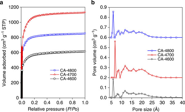 圖1、活性炭的孔隙率;罨奶急粯擞洖镃A-4T,其中4是活化KOH/碳比,T是活化溫度。顯示了氮吸附等溫線(a)和相應的孔徑分布曲線(b)。