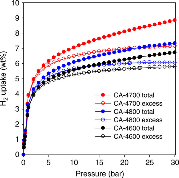 活性炭中的氫儲存需要具有最高表面積和適當尺寸的孔的材料。在-196和25℃下使用重量法在HidenXEMIS分析儀上在0-30巴的壓力范圍內研究活性炭的儲氫能力。圖2顯示了活性炭在-196℃下的過量和總氫吸收等溫線。對于所有CA-4T活性炭,氫吸收是可逆的,沒有滯后現象,并且在0-30巴的壓力范圍內沒有達到飽和。我們首先注意到1巴的氫吸收非常令人印象深刻,在3.1-3.9wt%的范圍內。這種儲氫比為高表面積活性炭傾向于在2-3重量%范圍內的任何報告的值高得多。我們將這種特別高的吸收特性歸因于非常高的微孔表面積和富氧表面的組合,特別是對于3.9重量%的活性炭樣品CA-4700。富氧表面的效果是對于活性炭樣品CA-4600,其盡管具有適度總表面積和微孔表面,仍然表現出的吸收比以前發(fā)現的活性炭材料具有高得多的表面積。經過研究發(fā)現,具有氧官能團的活性炭效果預期在低壓下具有最大效果,其中氫和表面之間的相互作用比在較高壓力下更重要,其中通過空間填充機制更可能發(fā)生氫吸收。