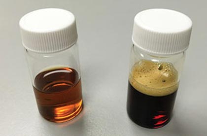 圖4.左小瓶經(jīng)過(guò)活性炭過(guò)濾。右小瓶未經(jīng)過(guò)活性炭其中的泡沫穩(wěn)定長(zhǎng)達(dá)4小時(shí)。