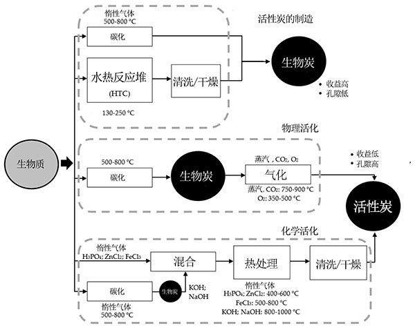 一般而言,活性炭吸附劑可以由其組成中具有高比例碳的任何前體制造。因此,生物質(zhì)材料是活性炭吸附劑的理想前體。在這項(xiàng)研究中,生物質(zhì)在熱處理后得到生物炭,生物炭經(jīng)過(guò)進(jìn)一步活化,而在活化步驟后獲得活性炭。常見(jiàn)的生物質(zhì)材料如橄欖核等等。圖2顯示了生物質(zhì)的活性炭制造方法。生物炭通常在碳化時(shí)制備,而活性炭需要使用物理和化學(xué)活化產(chǎn)生更加發(fā)達(dá)的孔隙。合成的活性炭的孔隙率,表面化學(xué)和產(chǎn)率高度依賴于起始生物質(zhì)組成和合成中使用的操作條件。